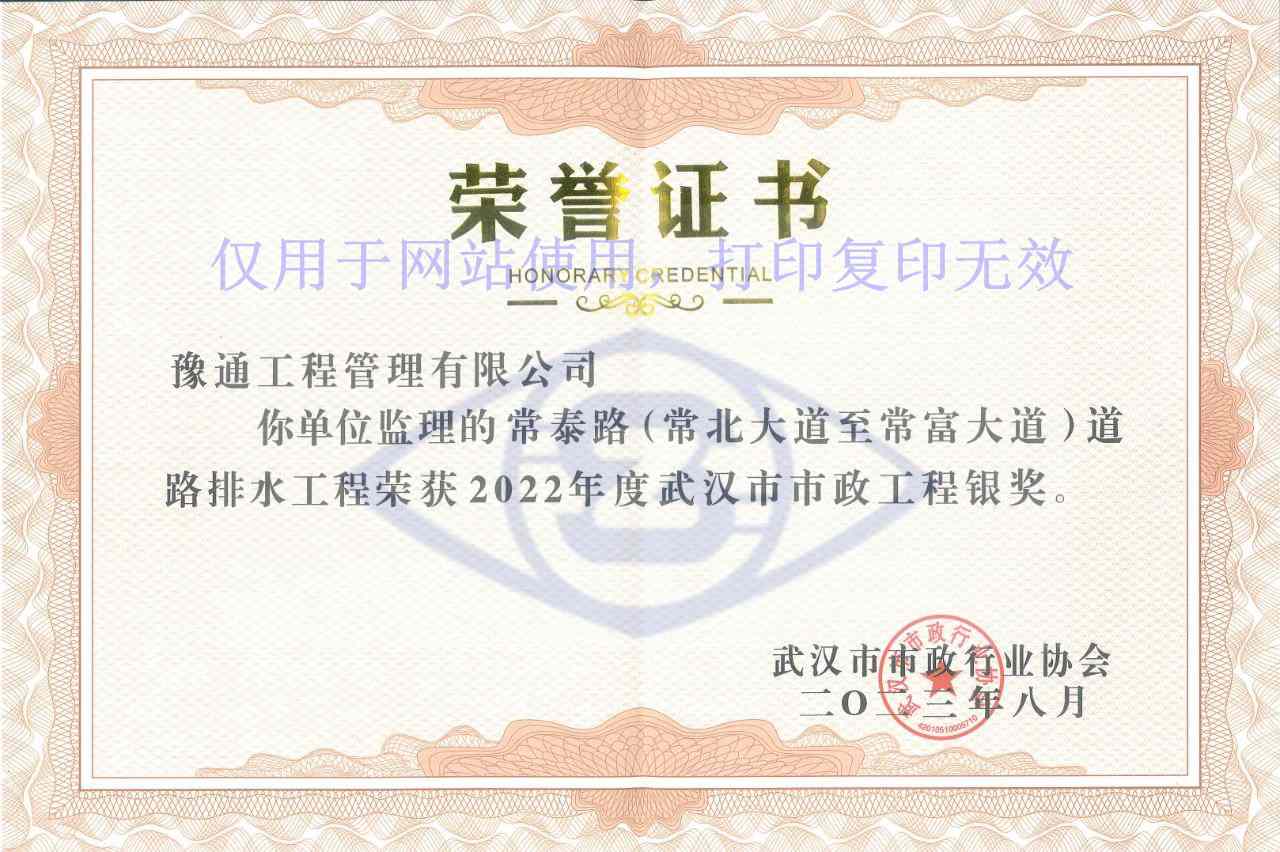 近日,武漢市市政行業(yè)協(xié)會(huì)頒發(fā)了2022年度武漢市市政工程獎(jiǎng)項(xiàng),公司監(jiān)理的常泰路(常北大道至常富大道)道路排水工程榜上有名。